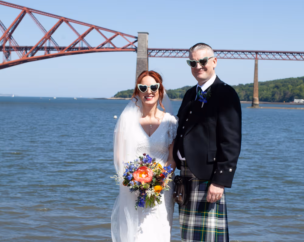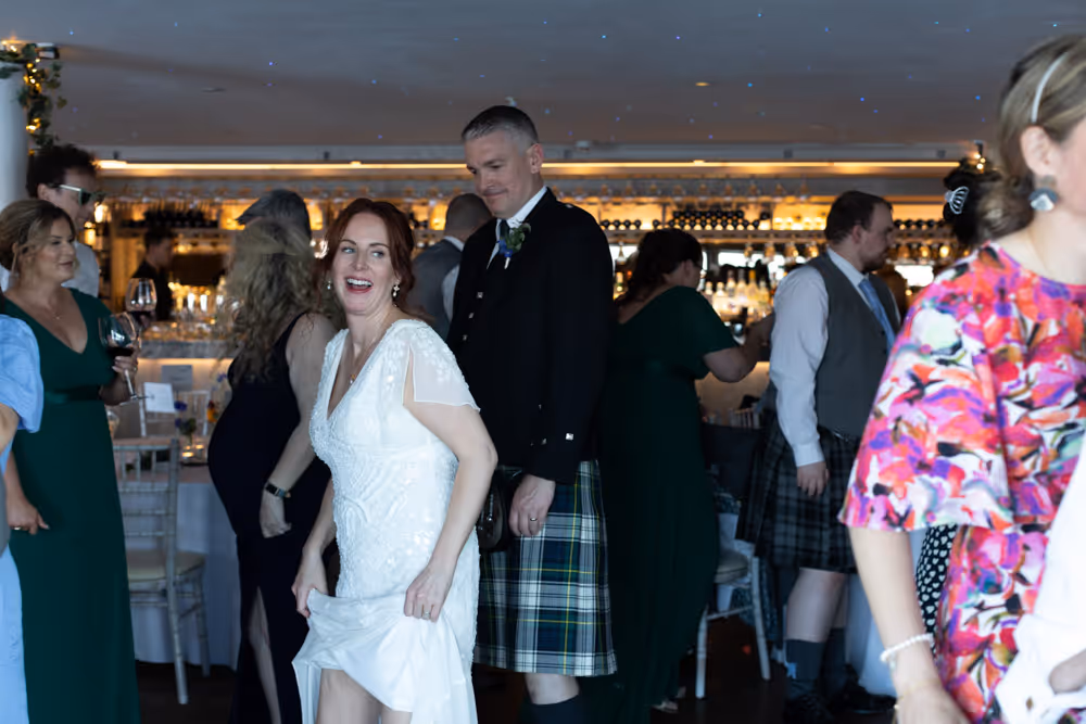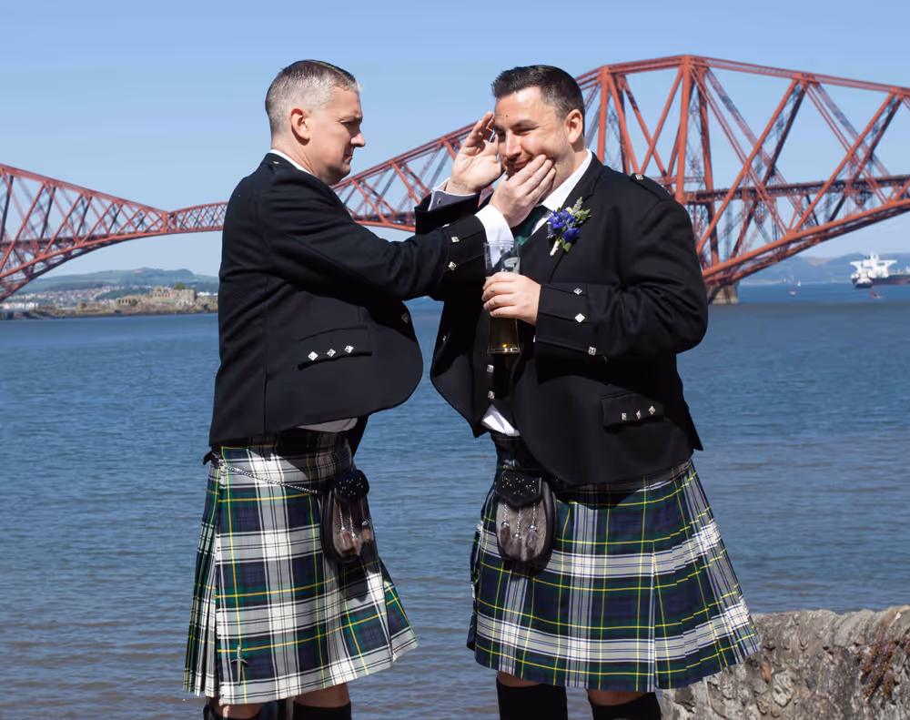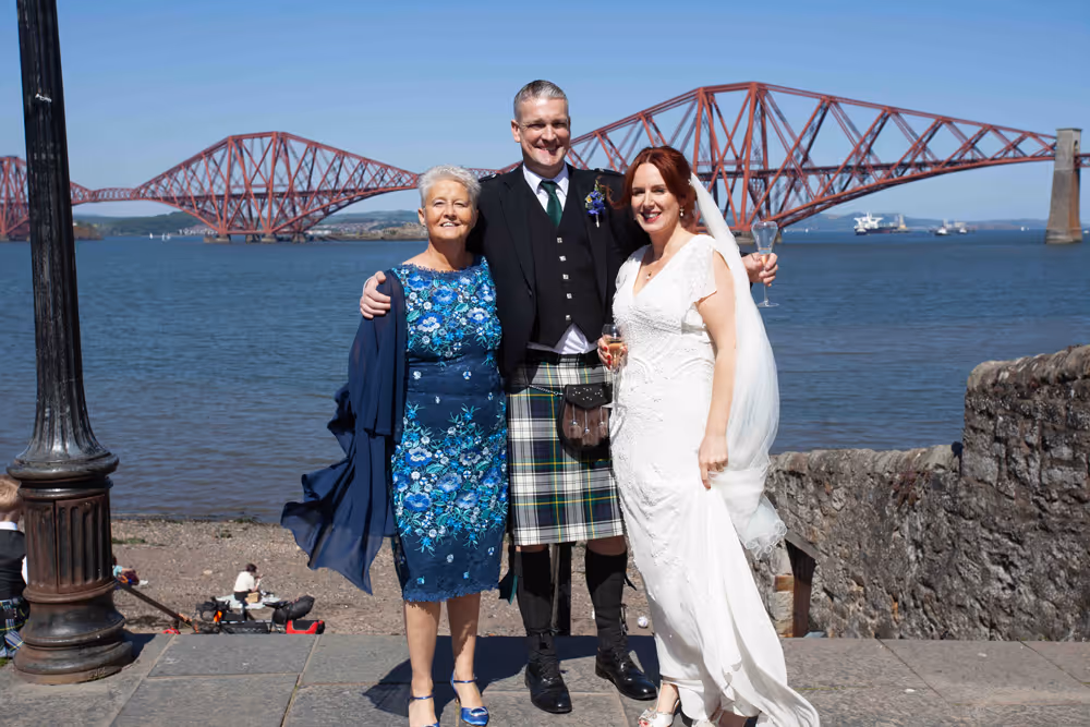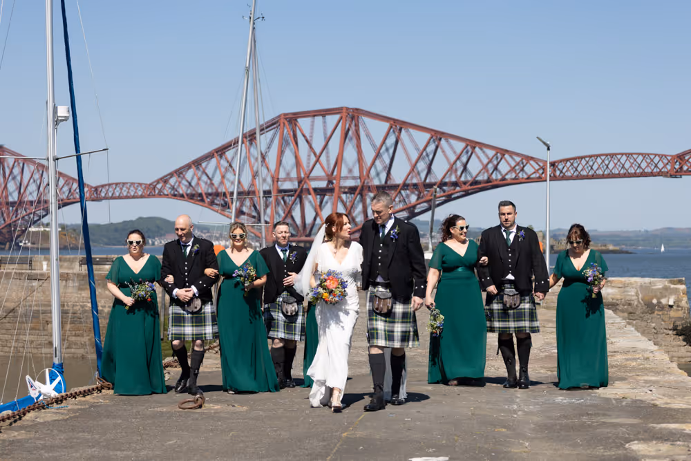 Blessed with a magical Scottish summer day, the wedding enjoyed endless blue skies, warm sunshine and a harbour shimmering in the light — exactly what couples dream of when planning a South Queensferry celebration by the sea. Guests relaxed on the balcony with drinks, admiring views towards the iconic Forth Bridge while children played along the waterfront. Laughter filled the air during heartfelt speeches before the evening party moved indoors for music and dancing. A perfect Orocco Pier wedding: relaxed, joyful and full of personality, beautifully captured in natural documentary-style storytelling. For their big day, the couple selected our Vintage Wedding Photography and Videography Package, ensuring every special moment was beautifully captured.