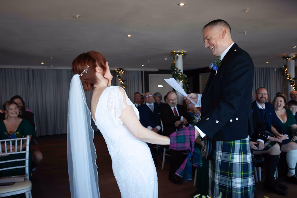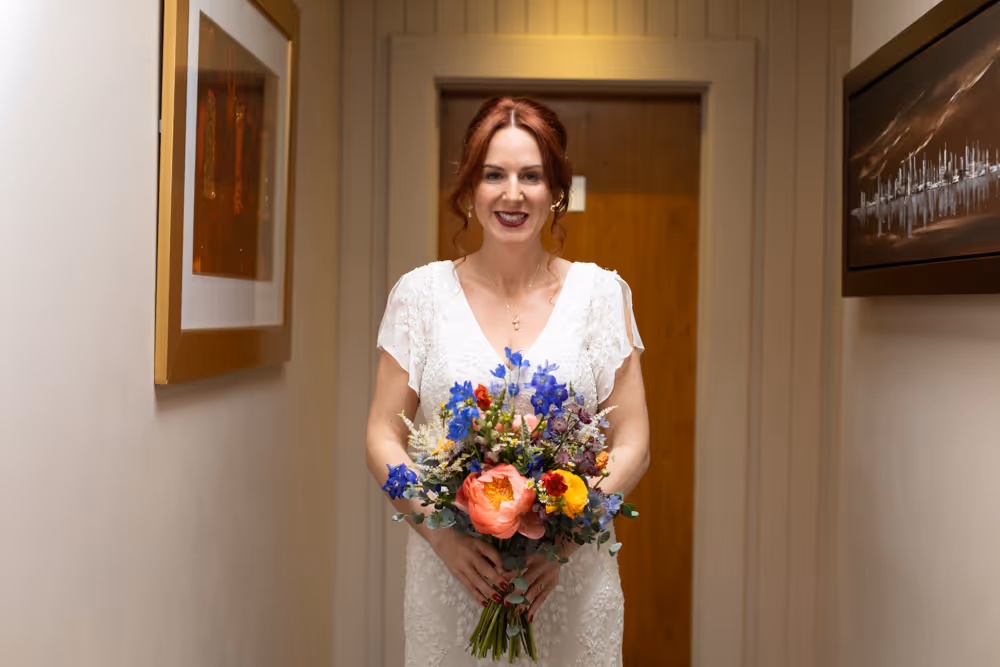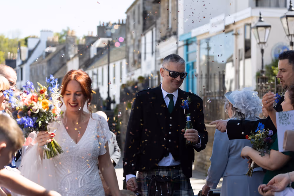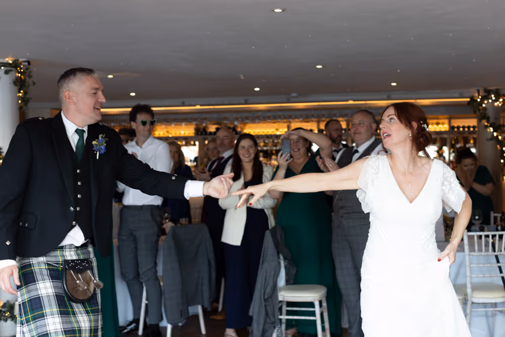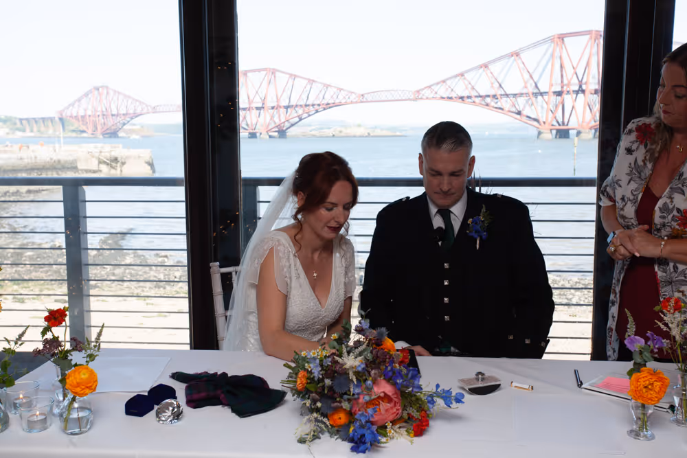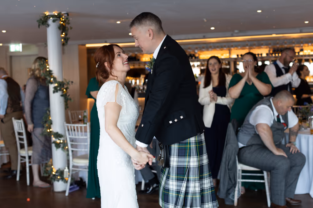 Blessed with a magical Scottish summer day, the wedding enjoyed endless blue skies, warm sunshine and a harbour shimmering in the light — exactly what couples dream of when planning a South Queensferry celebration by the sea. Guests relaxed on the balcony with drinks, admiring views towards the iconic Forth Bridge while children played along the waterfront. Laughter filled the air during heartfelt speeches before the evening party moved indoors for music and dancing. A perfect Orocco Pier wedding: relaxed, joyful and full of personality, beautifully captured in natural documentary-style storytelling. For their big day, the couple selected our Vintage Wedding Photography and Videography Package, ensuring every special moment was beautifully captured.